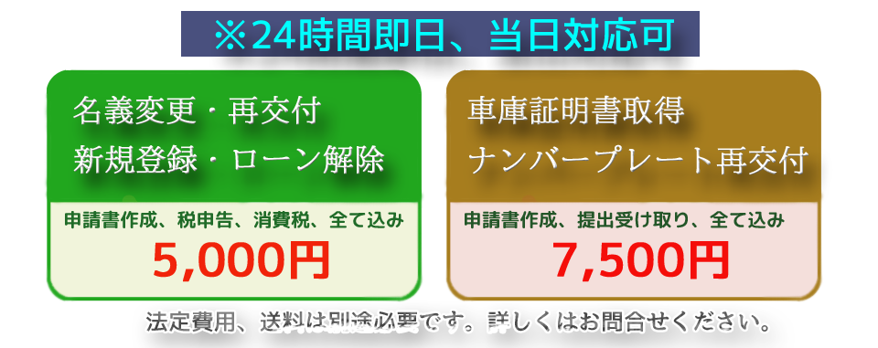 務所にお任せいただければ、運輸支局へのお車持ち込みが不要、ナンバー交換は土日祝日対応可です(詳しい条件はお問合せください)。